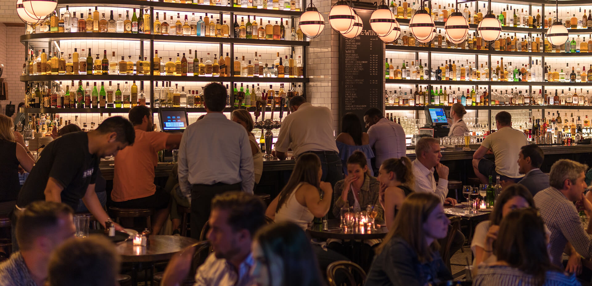 A warm, bustling dining room at peak time